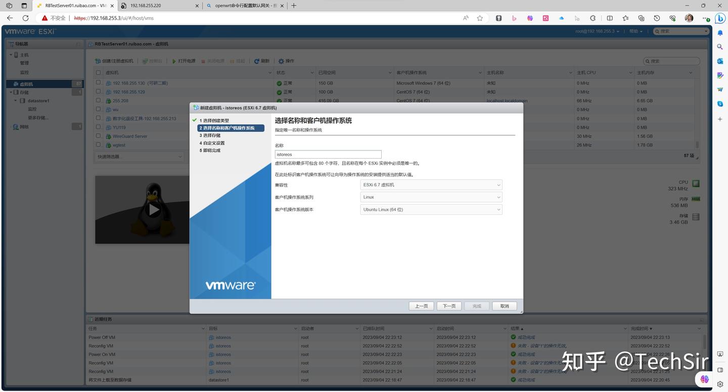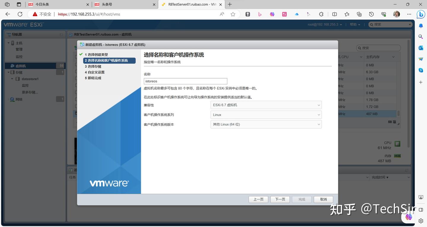 新页面中,在名称这里自由填写虚拟机的名字,比如istoreos,在客户机操作系统系列和版本这里,分别选择linux和其他linux64位,然后下一页。