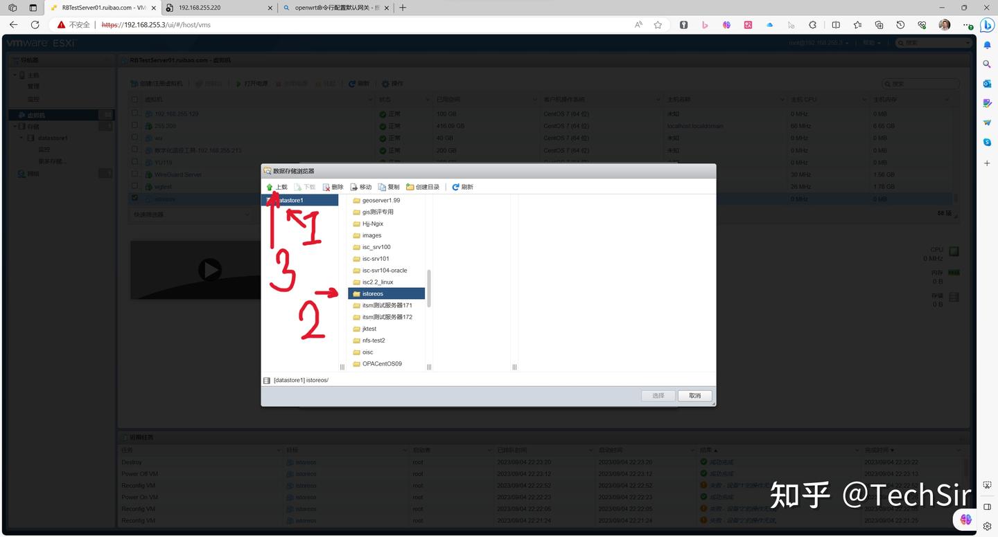 按照我图上标记的123,顺序选择存储盘,存储路径,然后点击“上载”,这三步的意思是上传你转换出来的VMDK文件,传到你刚才建立的虚拟机的制定目录,比如我建立的虚拟机名字叫istoreos,那么我就选择istoreos这个目录,然后点击“上载”,在弹出的窗口中,选择你转换出来的VMDK文件,注意是两个VMDK文件都要上传。上传完成,点击你上传上去的虚拟机(两个文件都上传完成后,就合二为一了),然后完成编辑。